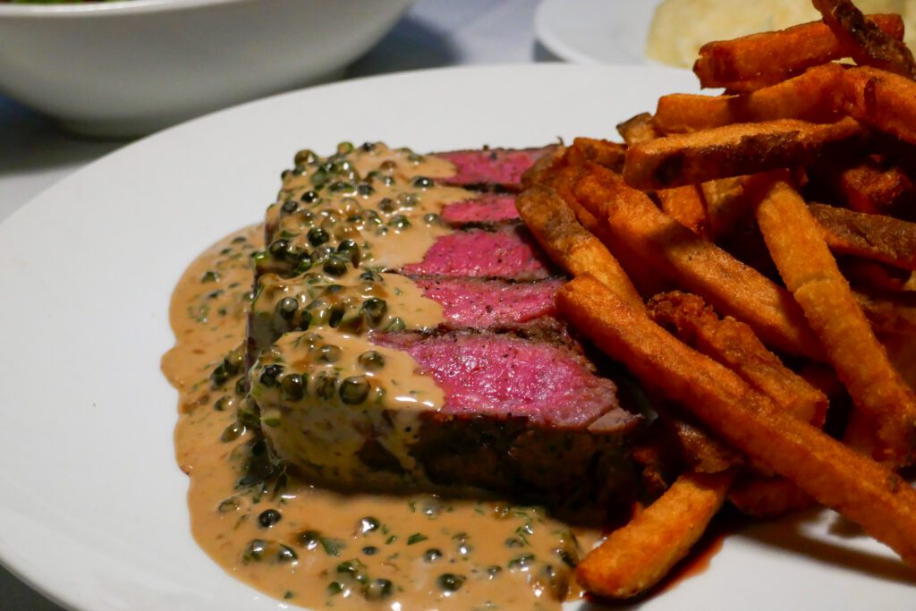 I like to break the rules a bit and order the steak frites with a side of peppery au poivre sauce. The fries are hand-cut and crispy, the perfect vehicle to mop up that excess sauce. But it’s the steak itself that stands out—as it should. A simply grilled New York strip steak boasts visible hatch marks and a rosy center. It comes sliced, making eating easy.
