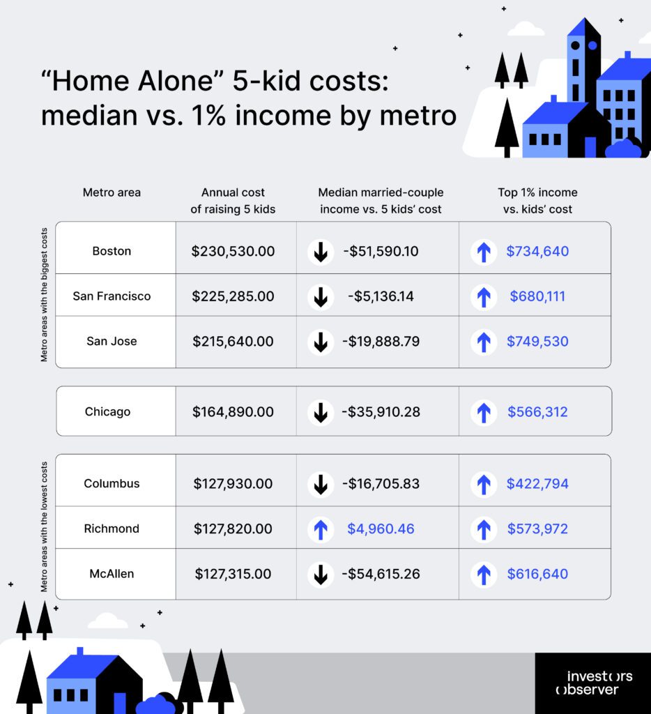 Recent studies by the team at InvestorsObserver examined living costs across major American urban areas and paint a challenging picture overall. On average, couples come up roughly $32,000 short each year when covering just the essentials like meals, daycare, and doctor visits for a brood of five. In places like Cleveland, that gap widens dramatically, hitting around $87,000 annually. Even in the movie’s own setting–a suburb outside Chicago–basics alone add up to about $165,000 yearly, leaving a typical dual-income household about $36,000 in the red.