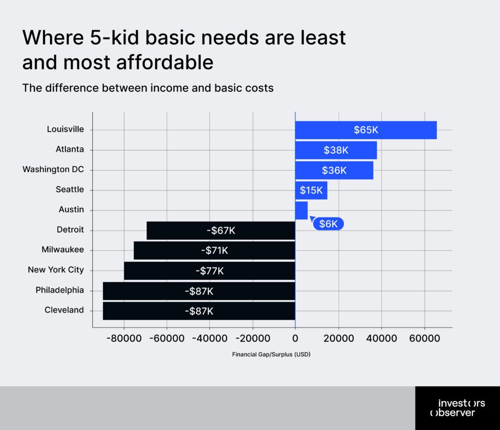 Take Louisville, for instance. There, the numbers show a comfortable cushion of over $65,000 after covering food, childcare, and health needs for five children. Atlanta follows with around $38,000 extra, while Washington, D.C., offers about $36,000 in breathing room. Seattle, Austin, and Richmond also tip into positive territory, with surpluses ranging from a few thousand to over $15,000.